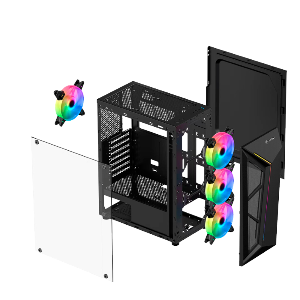 O Gabinete Gamer GB1713 combina design moderno e elegante, atendendo tanto ao público gamer quanto ao profissional. Seu painel frontal em malha de metal e fibra garante excelente fluxo de ar e suporte para múltiplos fans, enquanto a lateral em vidro temperado permite exibir os componentes internos com estilo.