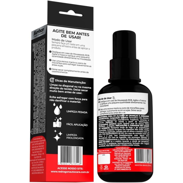 - Características: Redragon Surface é um produto com alto poder de limpeza. Sua fórmula natural, não prejudica seus equipamentos e proporciona uma limpeza excepcional. Produto de baixa espumação. Não mancha e não é corrosivo. Após a limpeza, seu Mousepad estará pronto novamente para garantir movimentos mais precisos para seu mouse!